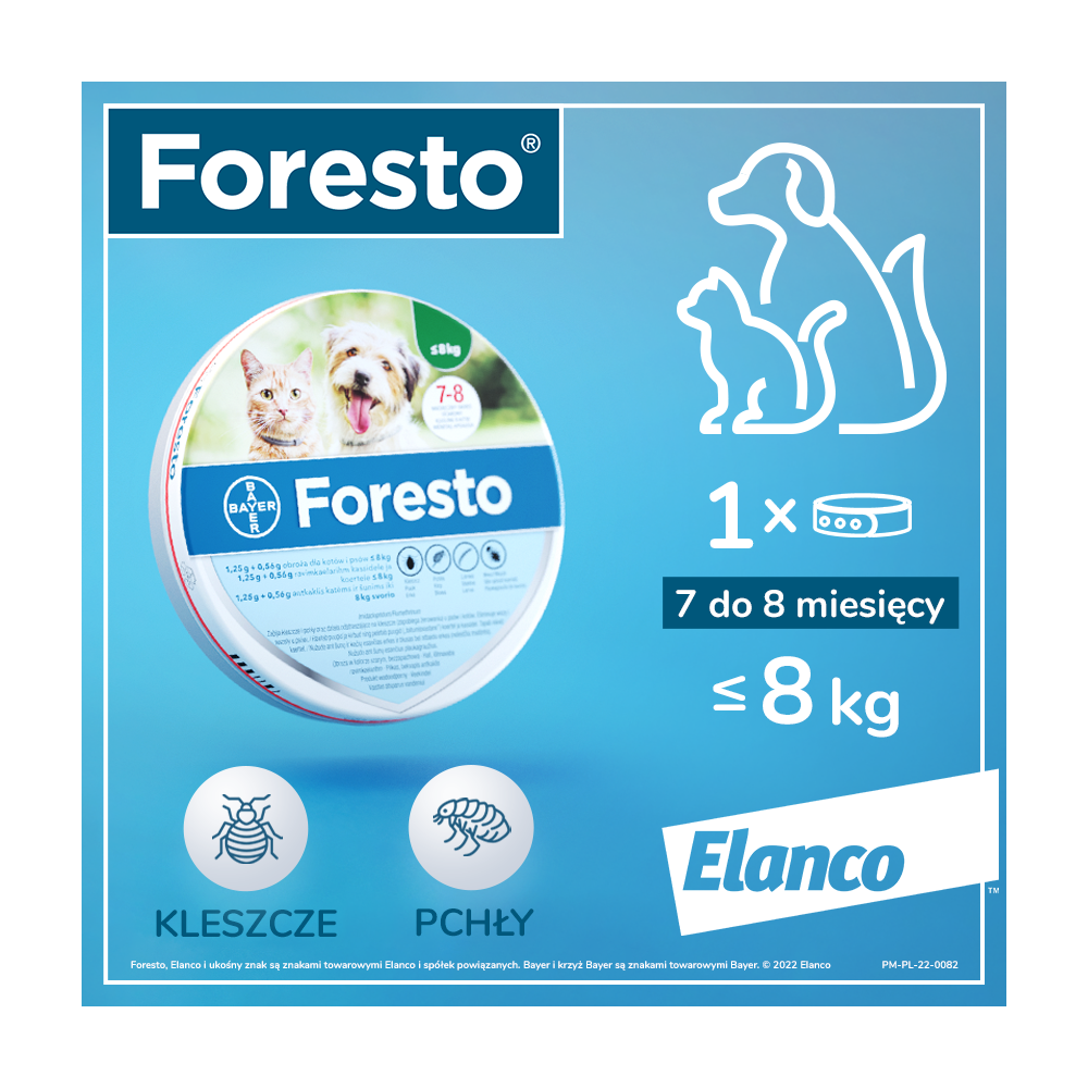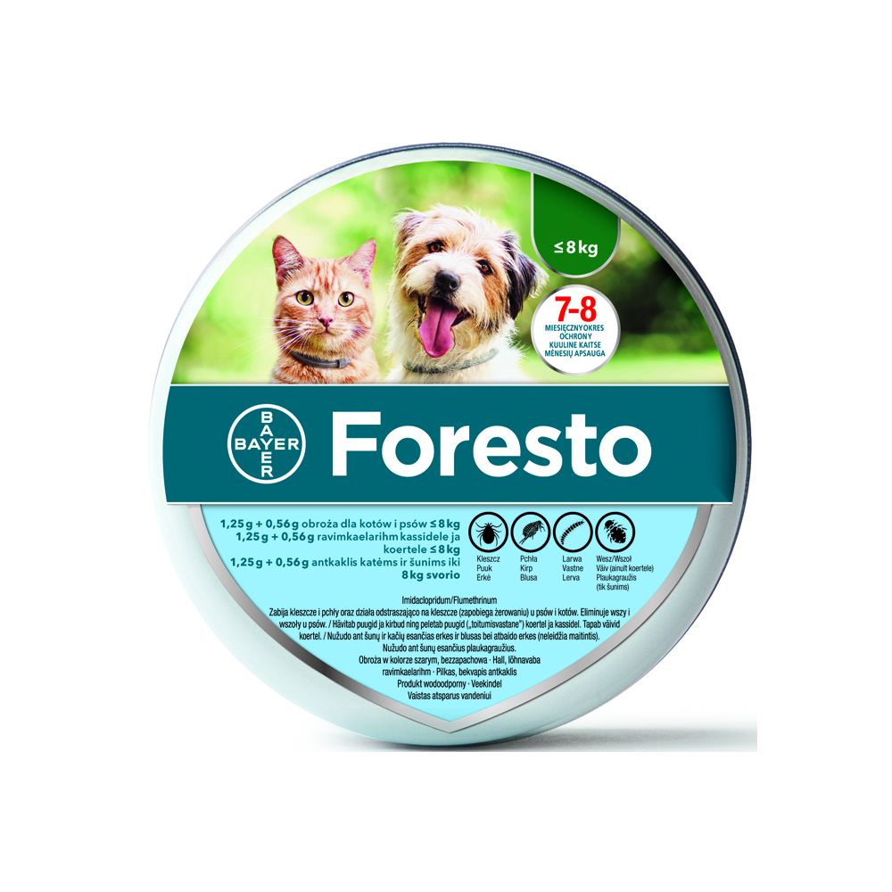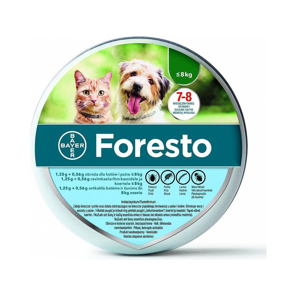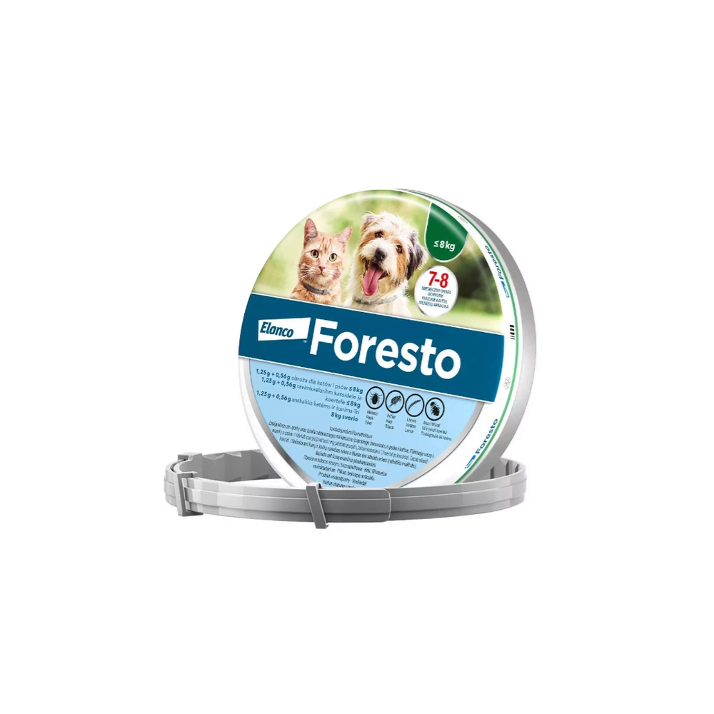 W celu leczenia i zapobiegania inwazji pcheł (Ctenocephalides felis, C. canis) przez okres 7 do 8 miesięcy. W celu ochrony bezpośredniego otoczenia zwierzęcia przed rozwojem larw pcheł przez 8 miesięcy. Foresto może być stosowane jako element strategii zwalczania alergicznego pchlego zapalenia skóry (APZS). Produkt wykazuje długotrwałą skuteczność roztoczobójczą (zabija kleszcze) w przypadku inwazji kleszczy (Ixodes ricinus, Rhipicephalus sanguineus, Dermacentor reticulatus) oraz odstraszającą (zapobiega żerowaniu) przy inwazji kleszczy (Ixodes ricinus, Rhipicephalus sanguineus) przez okres 8 miesięcy. Produkt wykazuje skuteczne działanie przeciwko larwom, nimfom i dorosłym osobnikom kleszczy. W przypadku uprzedniego występowania kleszczy u psa przed rozpoczęciem leczenia, założenie obroży może nie spowodować śmierci pajęczaków w ciągu 48 godzin; kleszcze mogą pozostać wczepione i widoczne. Dlatego też zaleca się usunięcie kleszczy występujących już na zwierzęciu w momencie zakładania obroży. Działanie zapobiegające inwazji nowych kleszczy rozpoczyna się w ciągu 2 dni po założeniu obroży. Produkt zapewnia pośrednią ochronę przed przeniesieniem patogenów Babesia canis vogeli oraz Ehrlichia canis przez gatunek kleszcza Rhipicephalus sanguineus tym samym redukuje ryzyko babeszjozy oraz erlichiozy psów przez okres 7 miesięcy. Ograniczenie ryzyka zarażenia pierwotniakami Leishmania infantum przenoszonymi przez muchówki Phlebotomus (muchy piaskowe), przez okres do 8 miesięcy. W celu leczenia inwazji wszołów (Trichodectes canis).