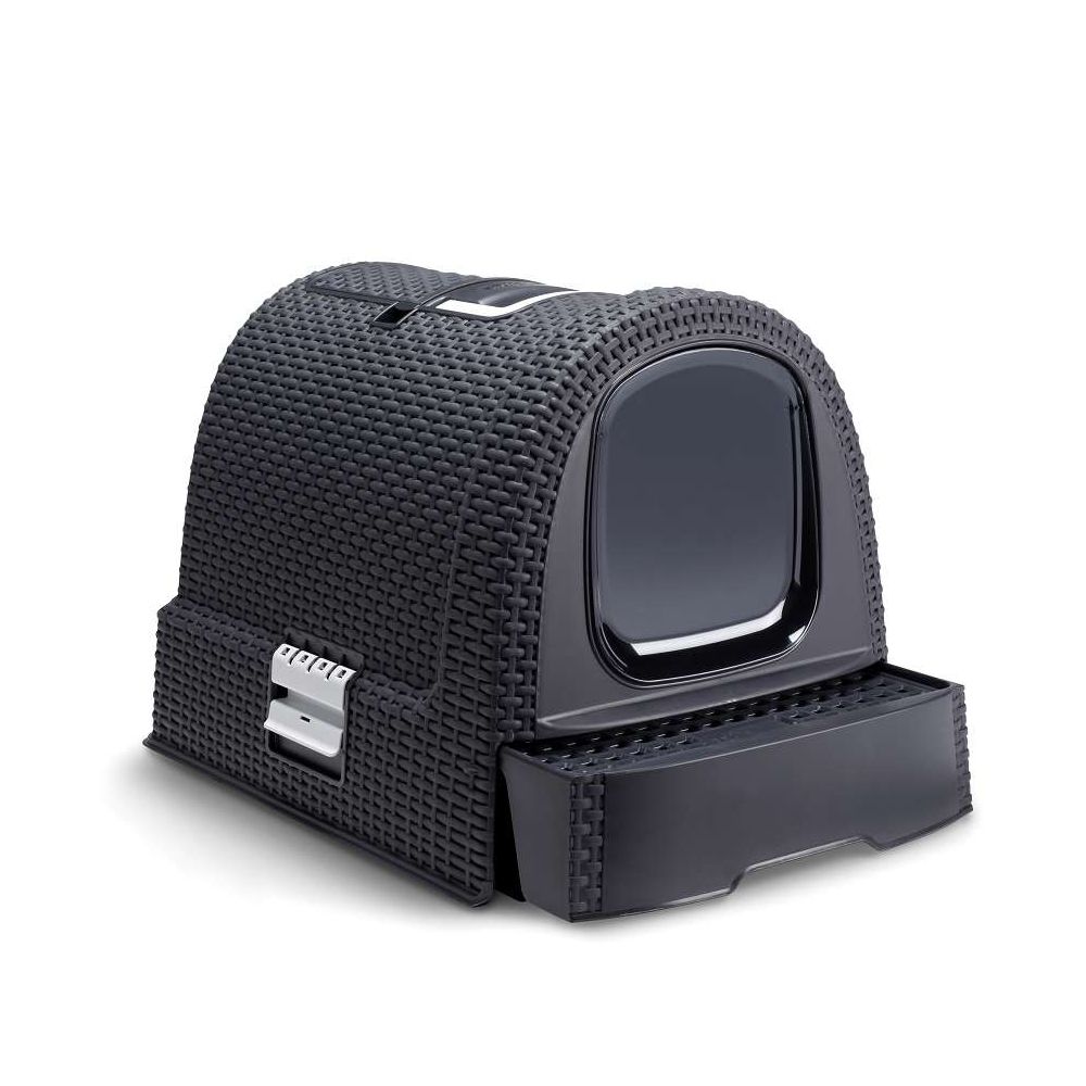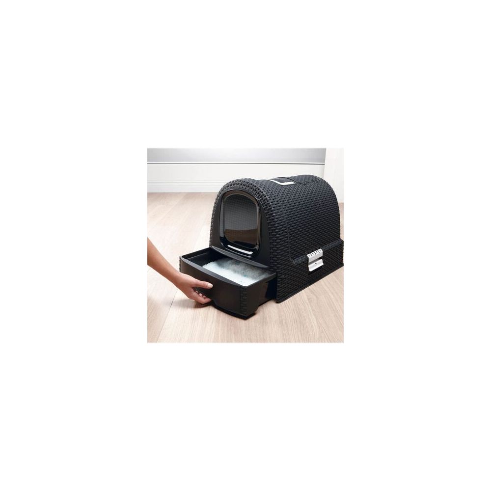 Kuweta została wykonana z wysokiej jakości materiału przypominającego ratan, który jest również łatwy do utrzymania w czystości. Posiada szczelne zatrzaski, zapobiegające wysypywaniu się żwirku, posiada szufladę na żwirek.