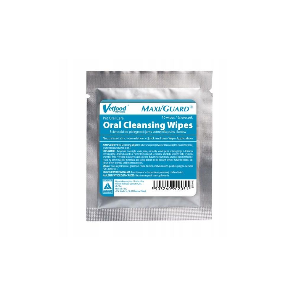 MAXI/GUARD® Oral Cleansing Wipes to łatwe w użyciu i przyjazne dla zwierząt ściereczki zawierające zneutralizowany cynk o pH 7. Specjalna faktura produktu zapewnia łagodne mechaniczne czyszczenie płytki nazębnej i bakterii powodujących nieprzyjemny zapach z pyska bez ryzyka uszkodzenia tkanki dziąseł. Zastosowany bezsmakowy środek odświeża oddech i bezpiecznie czyści jamę ustną zarówno psów jak i kotów.