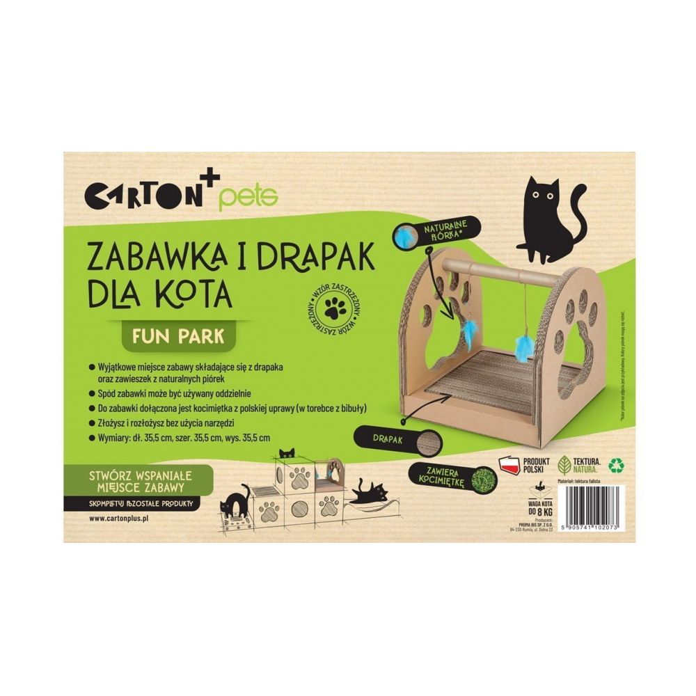 Carton+pets zabawka i drapak Fun Park to miejsce zabawy składające się z drapaka oraz zawieszek z naturalnych piórek.