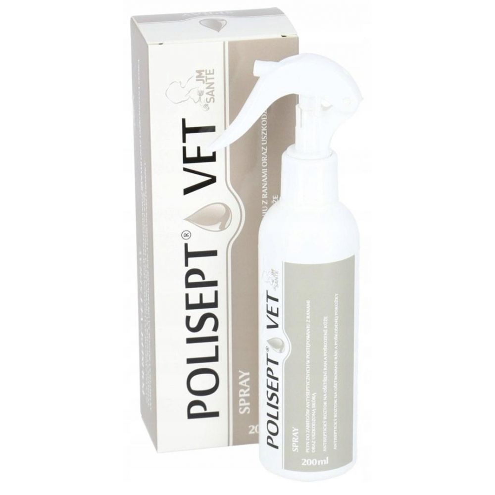 Polisept Vet Spray - do przemywania i dezynfekcji ran zakażonych, skaleczeń, do pielęgnacji ran po zabiegach chirurgicznych w tym szwów chirurgicznych i do wielu innych zastosowań. Jeden z preparatów z rodziny Polisept Vet, produktów służących do profesjonalnej i kompleksowej pielęgnacji i wspomagania gojenia ran.