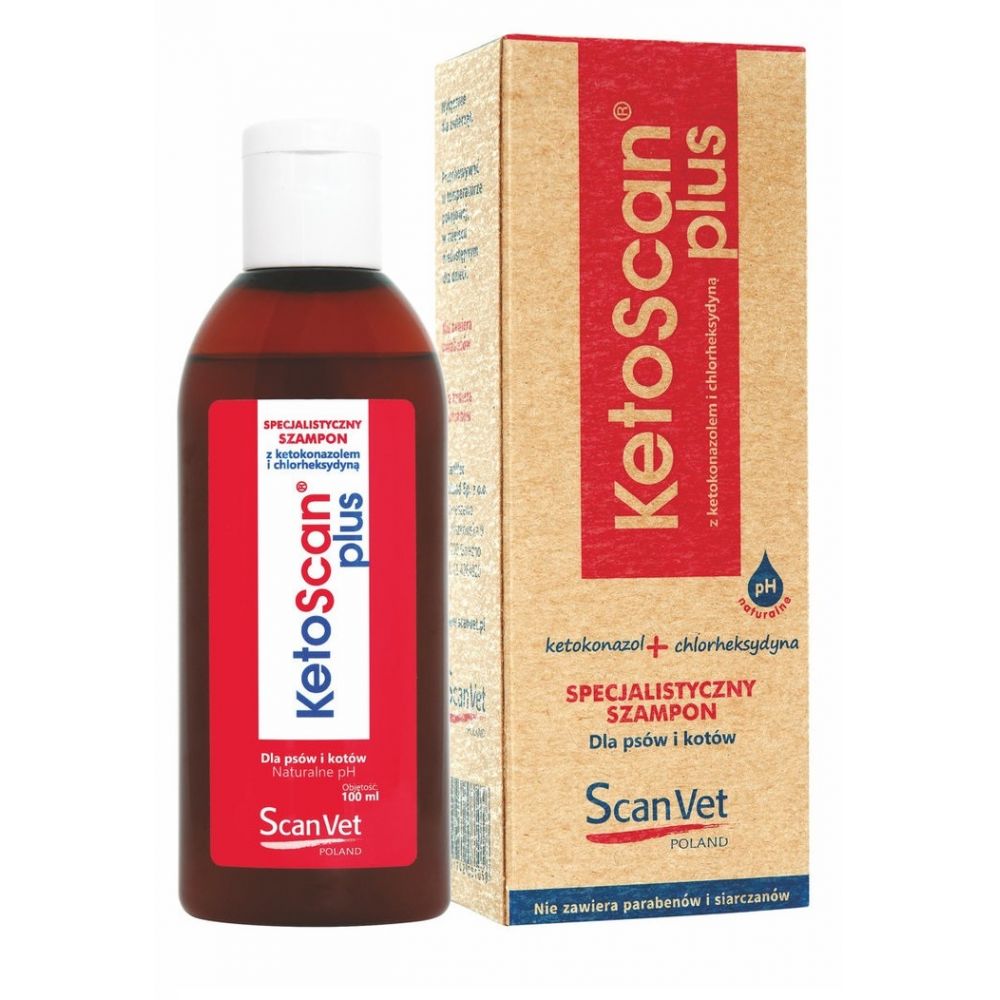 Szampon KetoScan PLUS przeznaczony jest do pielęgnacji skóry psów i kotów ze skłonnością do łupieżu, dermatoz i stanów zapalnych tła grzybiczego i bakteryjnego