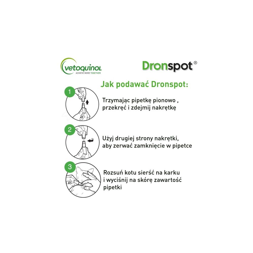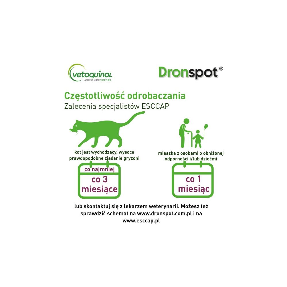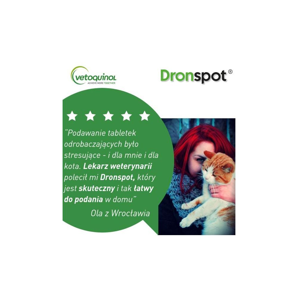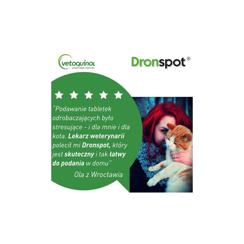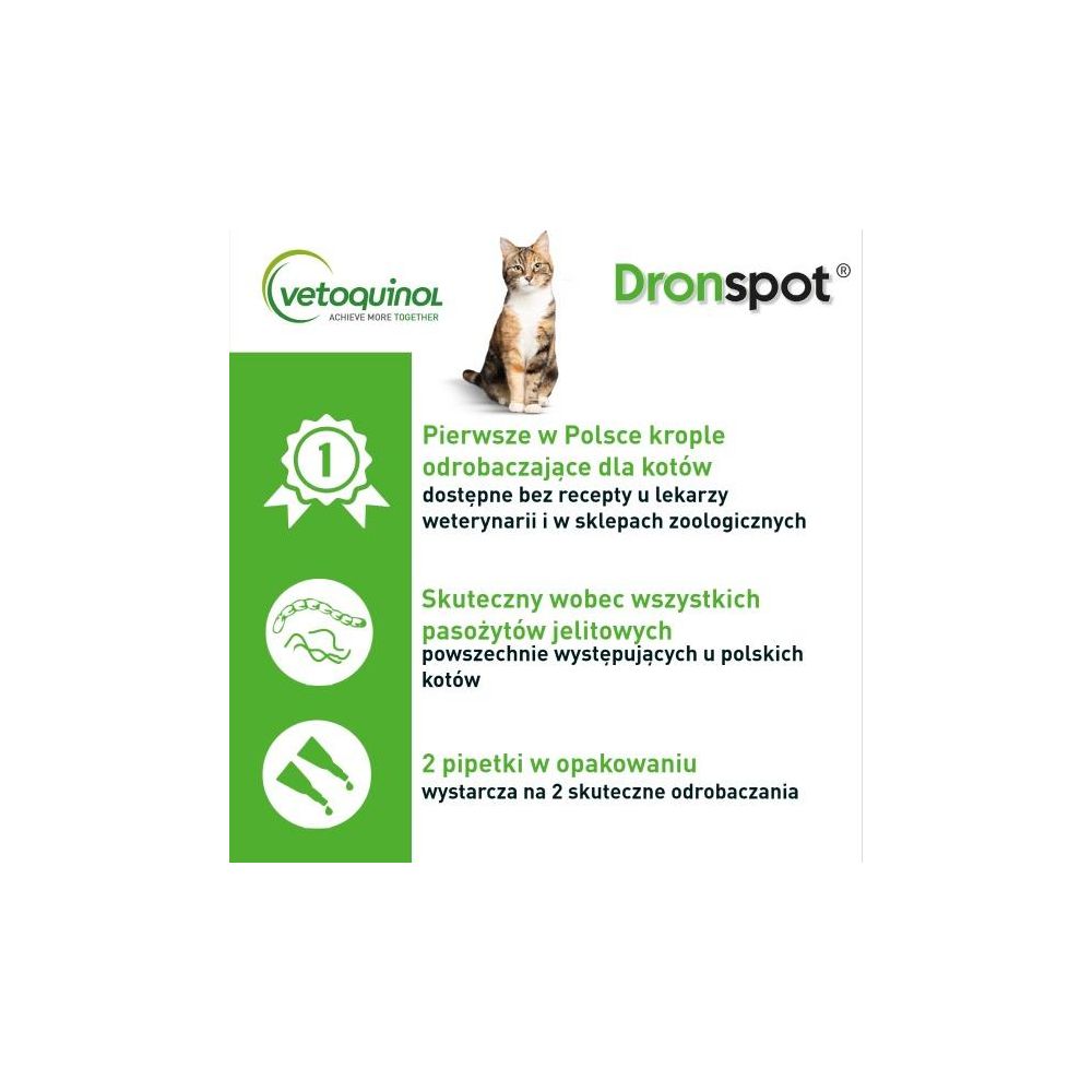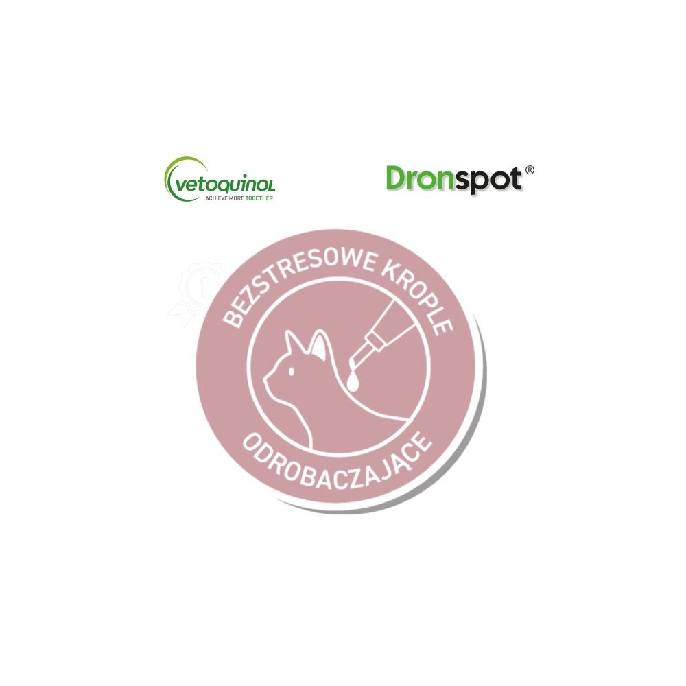 Przyjmowanie preparatów odrobaczających to dla Twojego kota duży stres? Wiemy jak temu zaradzić! W Vetoquinol wierzymy, że skuteczne odrobaczanie i spokój kota powinny iść w parze. Dlatego jest Dronspot – innowacyjny lek na robaki w postaci kropli spot-on do nakrapiania na kark. Łatwość aplikacji oraz szybkość działania sprawiają, że robaki giną już po pierwszym podaniu. Dronspot to pierwszy taki lek na pasożyty jelitowe dostępny bez recepty, także u lekarzy weterynarii!