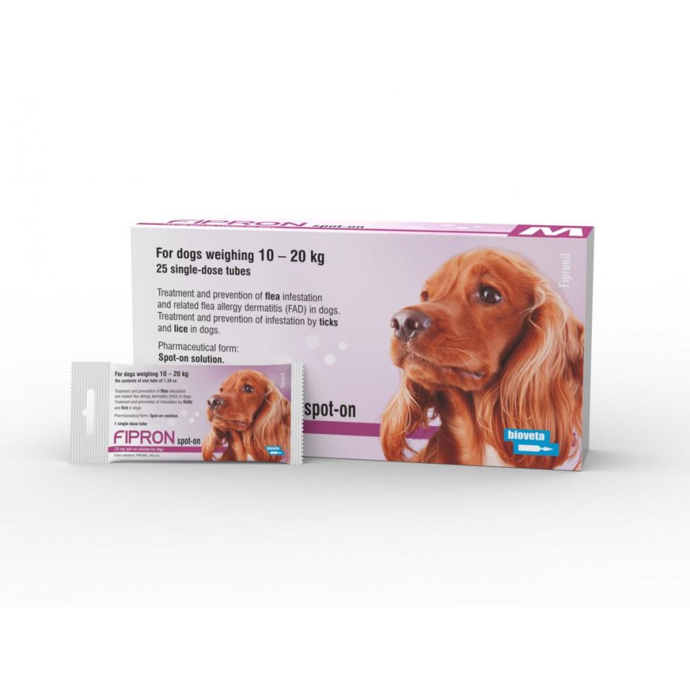 W przypadku braku danych, minimalny czas pomiędzy dwoma dawkami wynosi 4 tygodnie.Sposób podawania: stosowanie punktowe.Dawkowanie zależy od wagi zwierzęcia.Psy o wadze powyżej 10 kg i do 20 kg: zawartość jednej tubki 1,34 ml (M).Zapewnia to minimalną zalecaną dawkę fipronilu 6,7 mg/kg mc.Zaleca się terapię miesięczną w przypadku wysokiego ryzyka zakażenia pchłami, jeśli pies uczulony jest na ukąszenia pcheł, w przypadku koniecznej kontroli zakażenia, lub przy częstym kąpaniu psa, z wykorzystaniem szamponów hipoalergicznych lub nawilżających.
