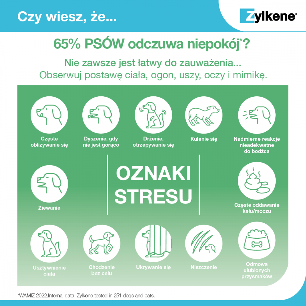 Zylkene® zawiera alfa-kazozepinę – naturalny biologicznie aktywny peptyd otrzymywany z mleka. Alfa-kazozepina jest znana z wywoływania stanu relaksacji u noworodków karmionych mlekiem matki. Zylkene® zaleca się stosować u psów i kotów reagujących nadmierną bojaźliwością bądź niepokojem. Jest z powodzeniem stosowany w sytuacjach związanych z utratą stabilizacji środowiska i zmianami rytmu dnia codziennego zwierząt takich jak: