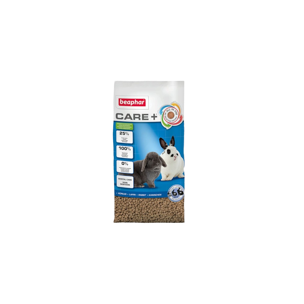 Care+ to doskonale zbilansowana, pełnoporcjowa, sucha karma klasy Super Premium, idealnie dopasowana do wymagań żywieniowych królika. Jest pokarmem o niskiej zawartości tłuszczu, bogatym we włókno konieczne dla zapewnienia właściwego trawienia. FOS i MOS działają na zasadzie prebiotyku, chroniąc tym samym jelita. Zawartość kwasów Omega 3 i Omega 6 korzystnie wpływa na serce i naczynia krwionośne. Zawartość Spiruliny oraz Echinacea wzmacnia system odpornościowy. Chelatowane minerały stymulują rozwój królika. Ekstrakt z jukki (Yucca schidigera) neutralizuje nieprzyjemny zapach odchodów. Odpowiednia twardość pokarmu ułatwia prawidłowe