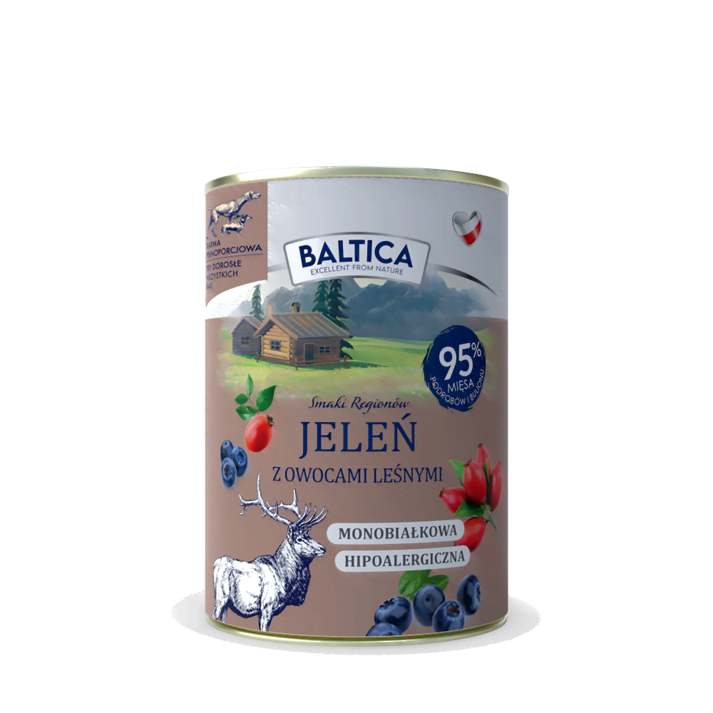 Skład:95% jeleń (68% mięsa z jelenia, 27% bulionu z jelenia), 3% jagód, 1% owoców dzikiej róży, 1% minerały.