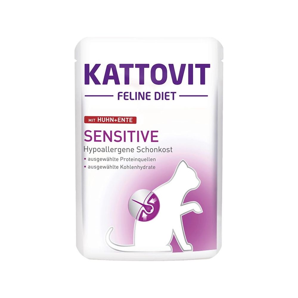 Kattovit Feline Diet Sensitive został opracowany dla wrażliwych kotów, które cierpią na określone alergie pokarmowe. Nietolerancja pokarmowa i alergia są częstym problemem u zwierząt. Ich objawy są widoczne najczęściej na skórze i sierści oraz pojawiają się poprzez trudności żołądkowe. Wszystkie te dolegliwości są bardzo nieprzyjemne dla zwierzaków. Ich najczęstszym powodem są nie tylko źródła białek, ale także różnorodne rodzaje zbóż. Z tej przyczyny w karmie używany jest tylko jeden rodzaj mięsa, bez dodatku węglowodanów, takich jak zboża.