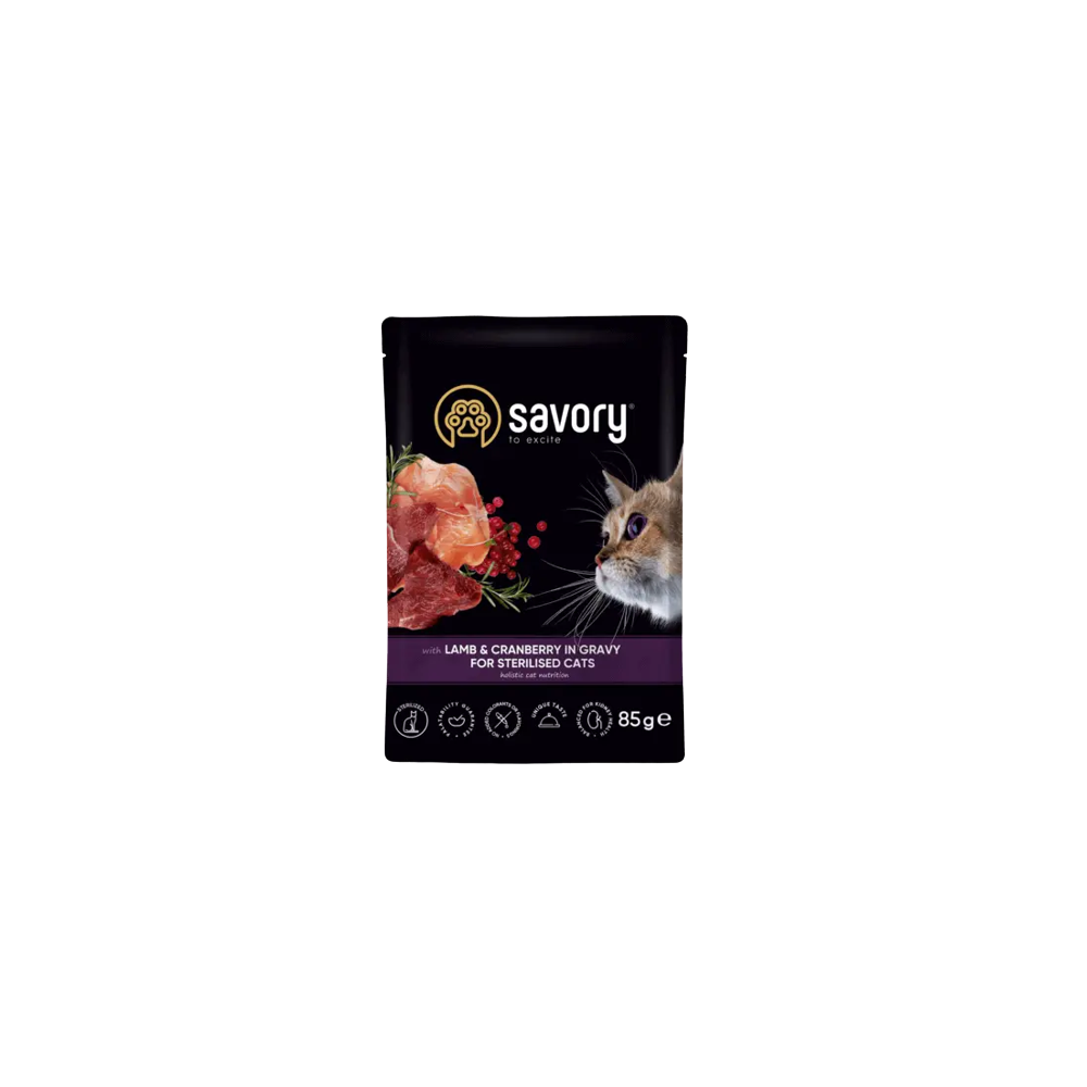 Savory Cat Adult Sterilised Lamb&Cranberries Gravy Karma Mokra Dla Kotów Po Sterylizacji i Kastracji z Jagnięciną i Żurawiną w Sosie 85 g