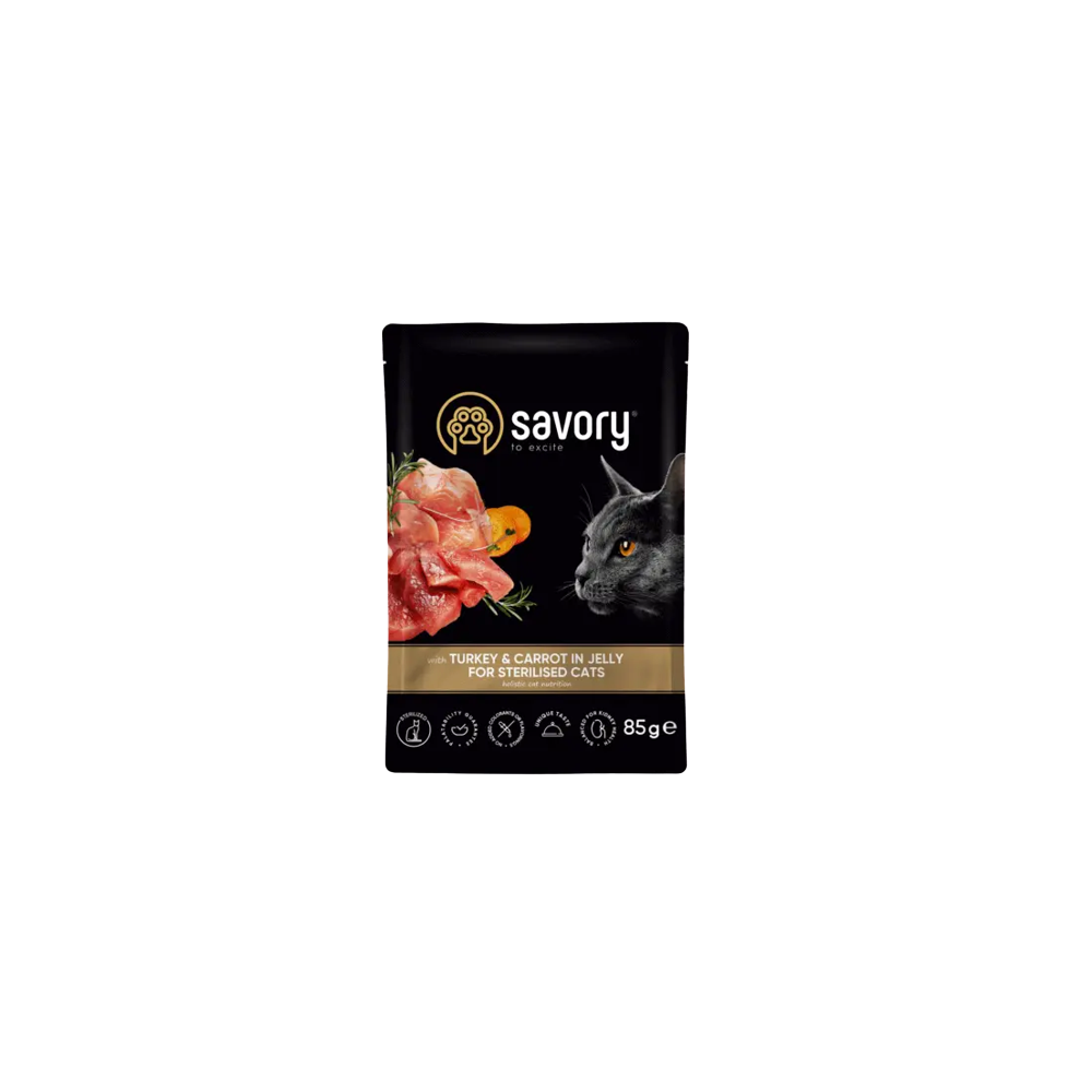 Savory Cat Adult Sterilised Turkey&Carrots Jelly Karma Mokra Dla Kotów Po Sterylizacji i Kastracji z Indykiem i Marchewką w Galaretce 85 g (Numer produktu: 154359)