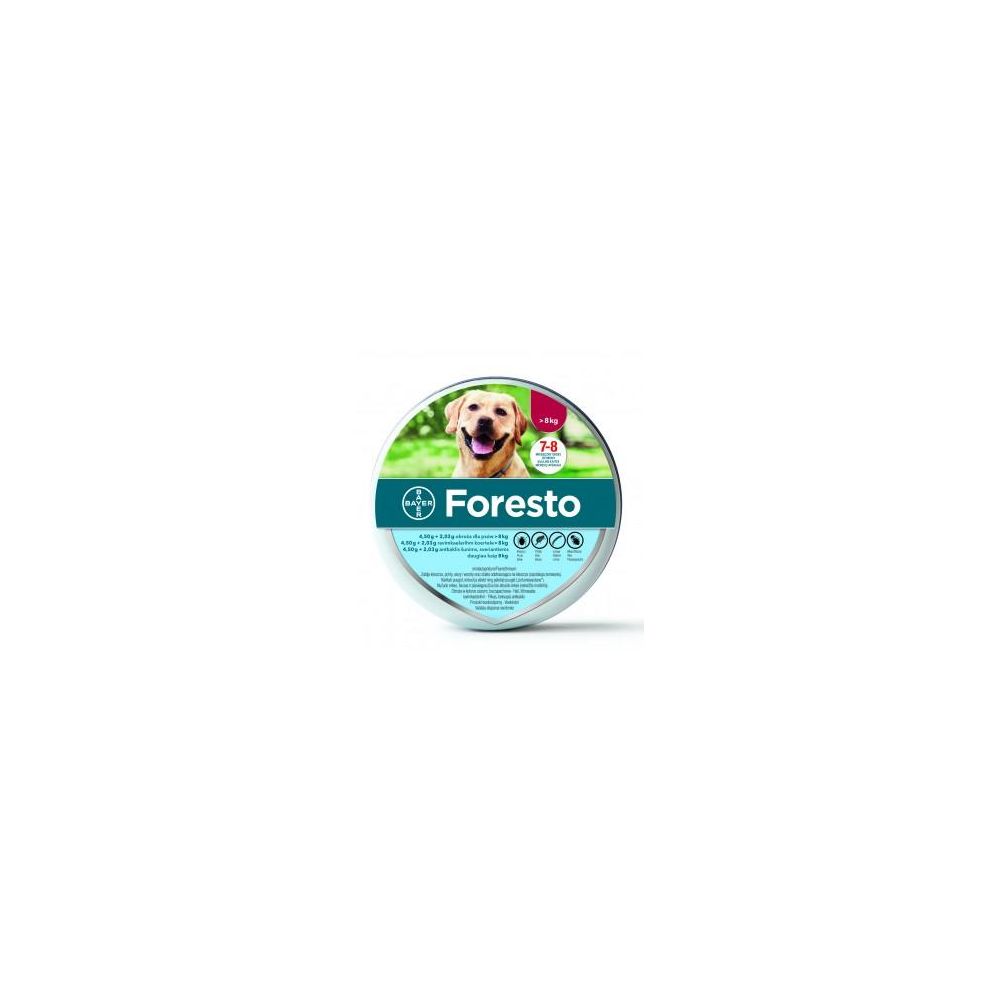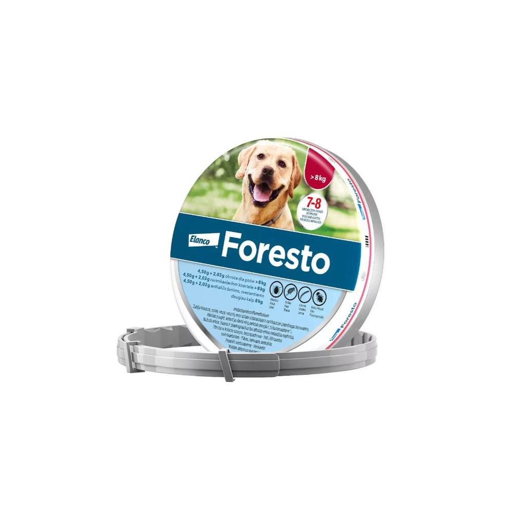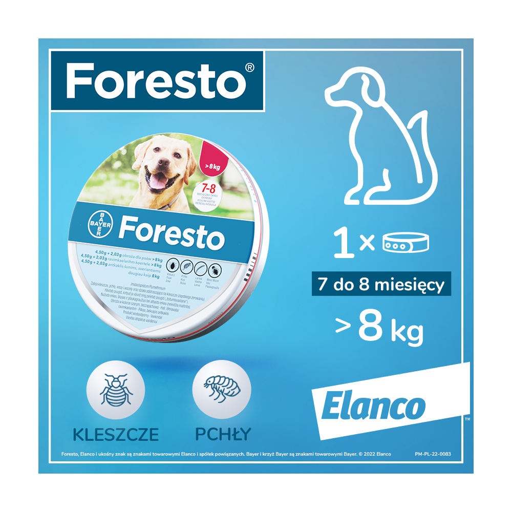 Obroża przeciwkleszczowa Foresto skutecznie działa także na inne pasożyty, które mogą powodować groźne choroby u zwierząt domowych. Obroża na pchły Foresto zwalcza i zapobiega inwazji pcheł przez okres od 7 do 8 miesięcy oraz chroni bezpośrednie otoczenie zwierzęcia przed rozwojem larw tych pasożytów przez ok. 10 tygodni. Foresto obroża powyżej 8 kg może więc być stosowana u większych psów jako jeden z elementów zwalczania alergicznego pchlego zapalenia skóry (APZS). Podobnie jak w przypadku kleszczy, obroża przeciwpchelna Foresto działa już w momencie kontaktu pasożyta z substancjami znajdującymi się na skórze i sierści zwierzęcia i zwalcza pchły jeszcze przed ukąszeniem psa. Obroża na pchły Foresto jest skuteczna i działa przez długi czas.