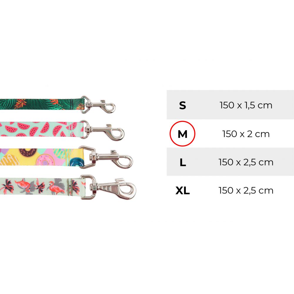 Smycz wykonana jest z wytrzymałej taśmy, odpornej na warunki atmosferyczne o niezwykle radosnej kolorystyce. Zastosowana taśma jest bardzo łatwa w czyszczeniu, wystarczy przetrzeć ją wilgotną szmatką lub wyprać, gdy zajdzie taka potrzeba i znów jest gotowa do użycia. Wygodna rękojeść zapewnia dużą pewność prowadzenia psa. Przy uchwycie znajduje się oczko służące do wygodnego przypięcia pojemnika na woreczki.