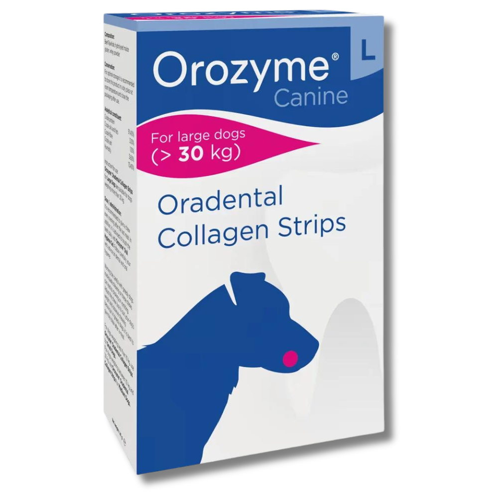 OROZYME Oradental Collagen Stripes L Kolagenowe gryzaki to innowacyjne rozwiązanie w dbaniu o higienę jamy ustnej dużych psów (powyżej 30 kg). Dzięki opatentowanej formule enzymatycznej, której zadaniem jest usprawnienie przeciwbakteryjnego działania śliny, oraz dodatkowym substancjom antyseptycznym ograniczającym liczbę bakterii odpowiedzialnych za nieprzyjemny zapach, płytkę nazębną i kamień nazębny,