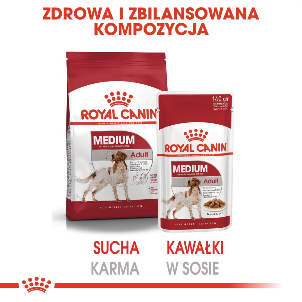 Karma mokra ROYAL CANIN® Medium Adult w sosie została opracowana specjalnie dla dorosłych psów ras średnich, o masie 11-25 kg, między 12 miesiącem a 10 rokiem życia.