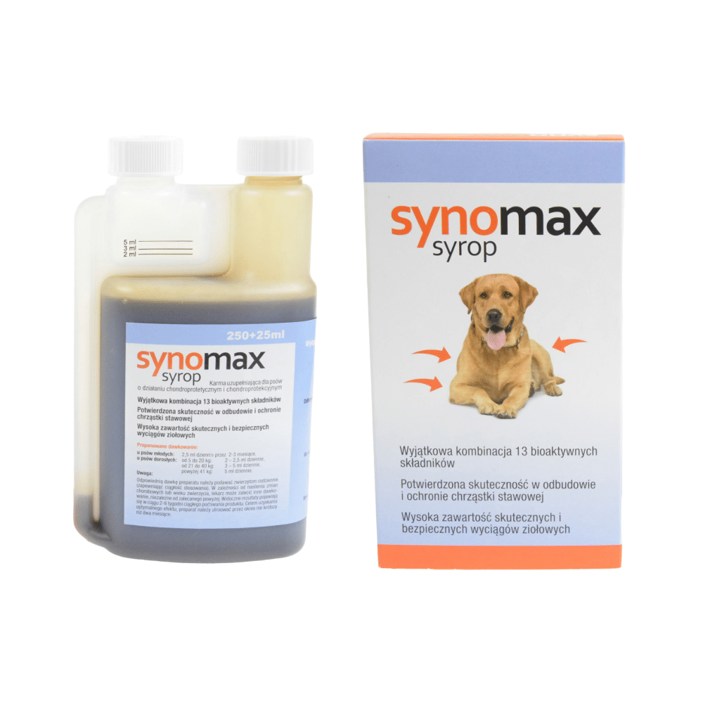 SYNOMAX Syrop na stawy dla psa 275ml to unikalny syrop, charakteryzujący się wyjątkowym składem, zapewnia kompleksowe działanie: przeciwbólowe, przeciwzapalne, a także chroni i regeneruje chrząstkę stawową. SYNOMAX Syrop na stawy dla psa 275ml jest szczególnie zalecany dla psów starszych, psów o dużej wadze, pracujących i wyścigowych, które są narażone na problemy stawowe. Dzięki wysokiej przyswajalności, syrop stabilizuje metabolizm chrząstki stawowej, wspiera jej regenerację i prawidłowe funkcjonowanie stawów, zwiększa produkcję mazi stawowej oraz pomaga w zapobieganiu zwężaniu szpary stawowej.