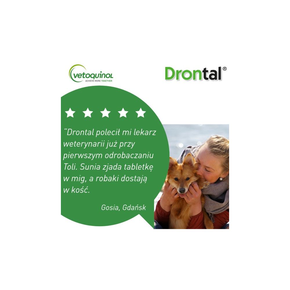 Komfort Twojego pupila jest dla nas priorytetem. Drontal Dog Flavour to jedyna tabletka o takim składzie dostępna bez recepty w sklepach zoologicznych i u lekarzy weterynarii. Zwalcza wszystkie powszechnie występujące pasożyty jelitowe polskich psów takie jak: glisty, tęgoryjce, włosogłówki, tasiemce oraz pierwotniaki Giardia spp. u szczeniąt i dorosłych psów. Drontal Dog Flavour możesz już podać przy pierwszym odrobaczaniu szczeniąt, czyli po ukończeniu 2 tygodnia życia.
